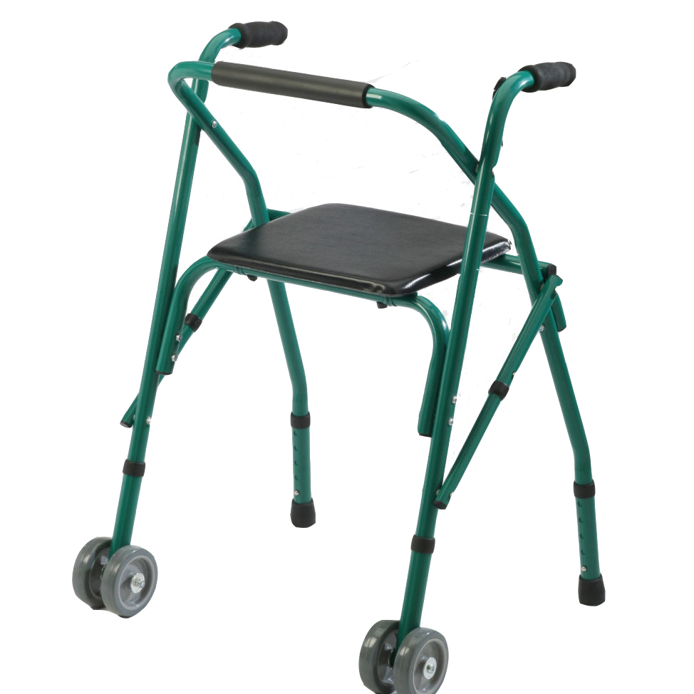 Andador plegable con asiento y respaldo acolchado, ruedas dobles delanteras.
