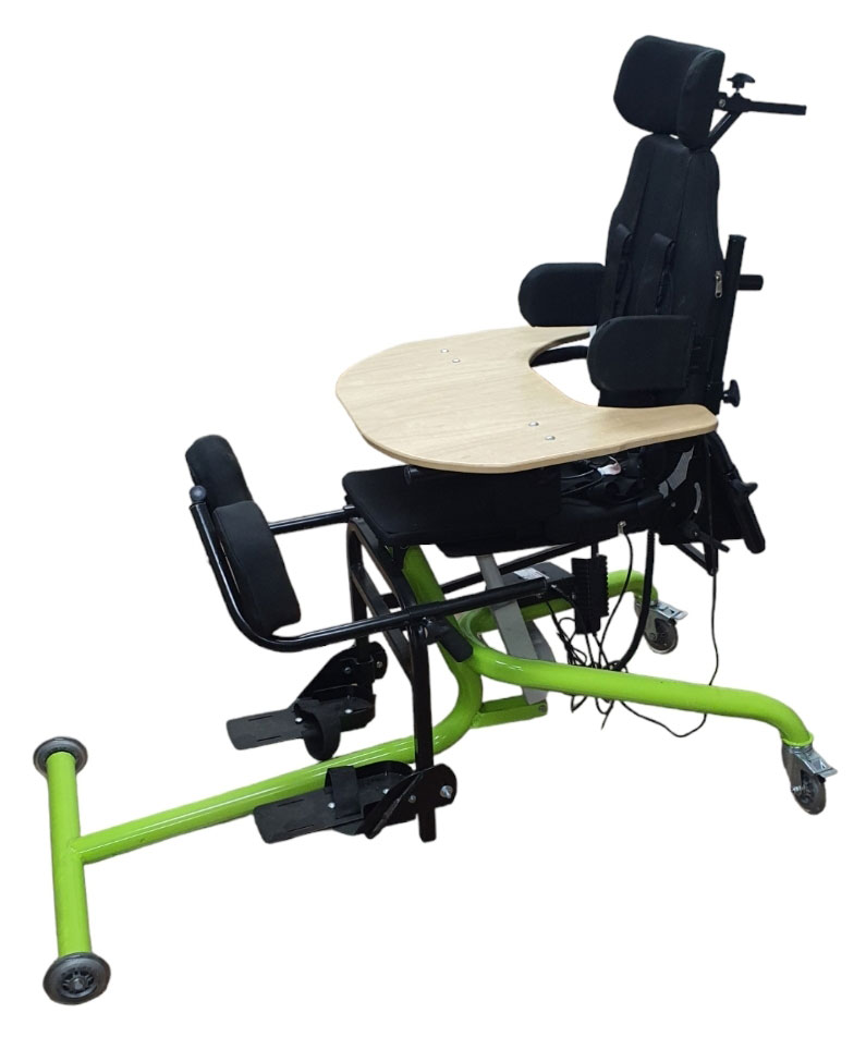 BIPEDESTADOR MULTIFUNCIÓN A MEDIDA DE CADA PACIENTE. CON TRES FUNCIONES; PARADA, SENTADA Y SUPINA. CONTROL DE TRONCO Y CADERA. MESA CON REGULACIÓN EN ALTURA Y PROFUNDIDAD. 4 RUEDAS, 2 CON FRENO DE GIRO LIBRE. ARNÉS DE TRONCO Y APOYACABEZA.