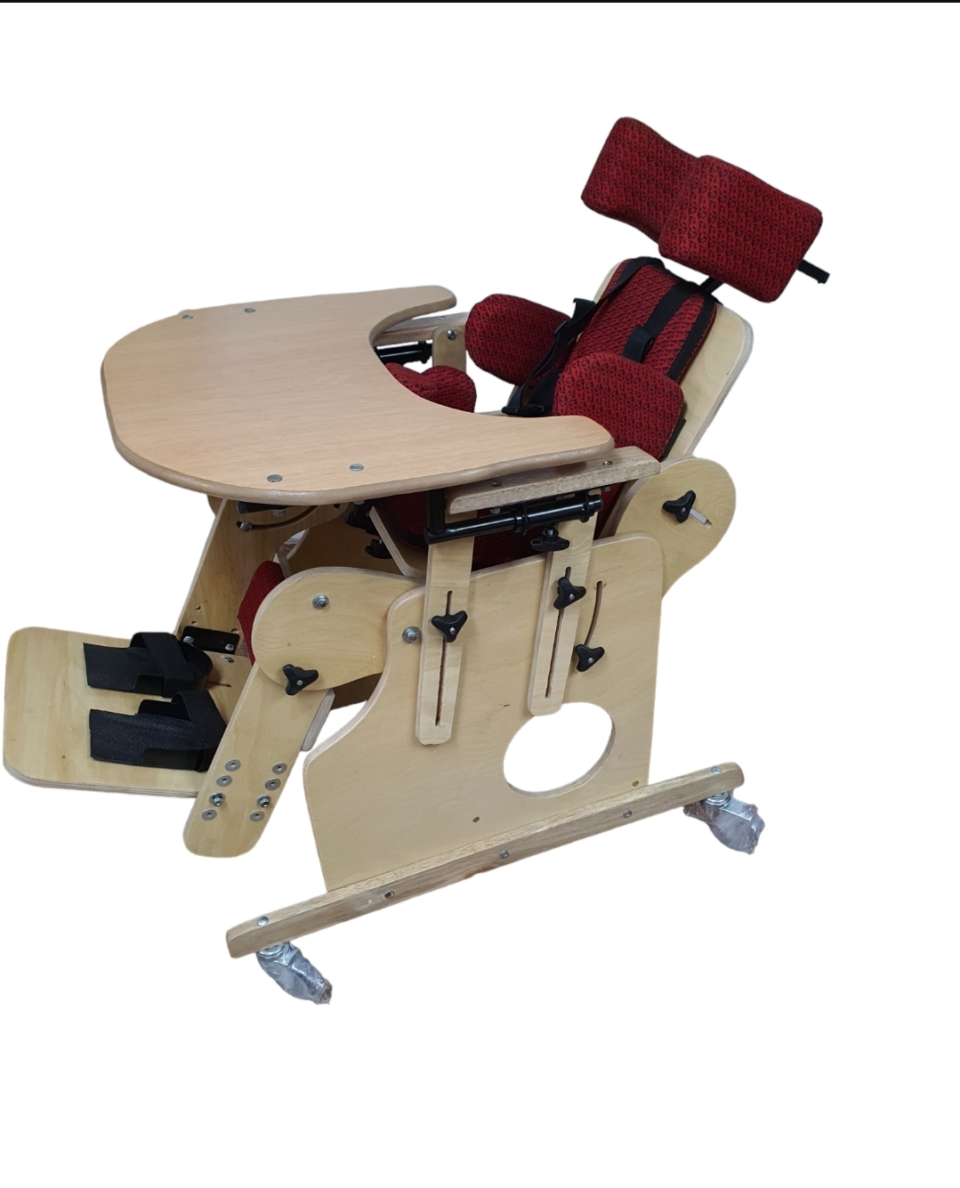Silla postural juvenil de madera, regulable en Tilt, con mesa y apoya brazos.