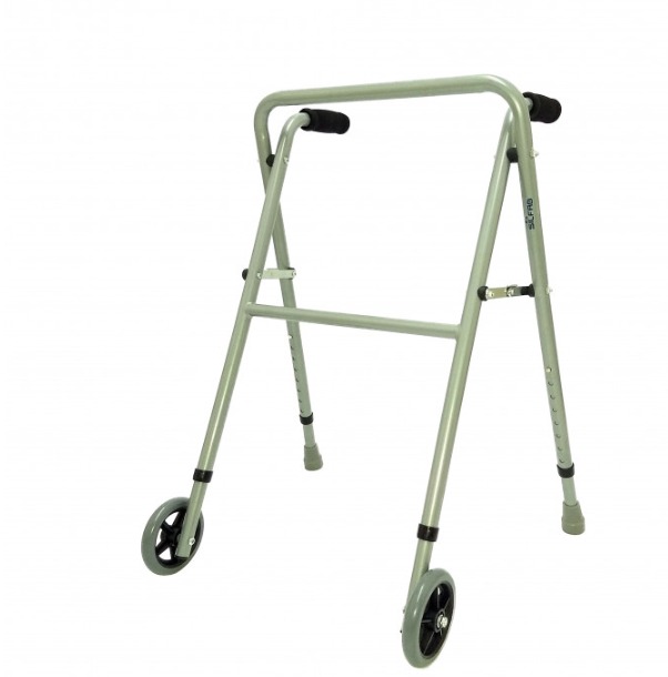 Andador tipo tijera de aluminio con ruedas delanteras y regatones traseros.