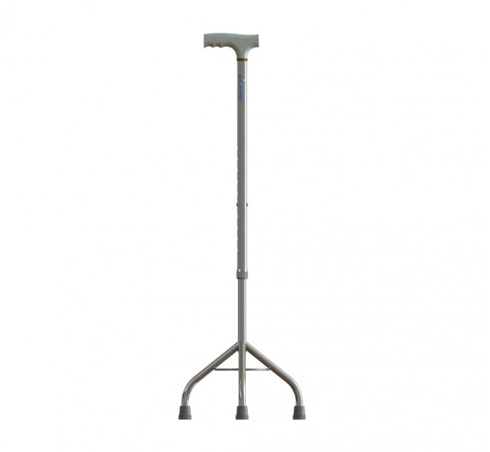 Bastón trípode de aluminio con mango en T, regulable en altura.