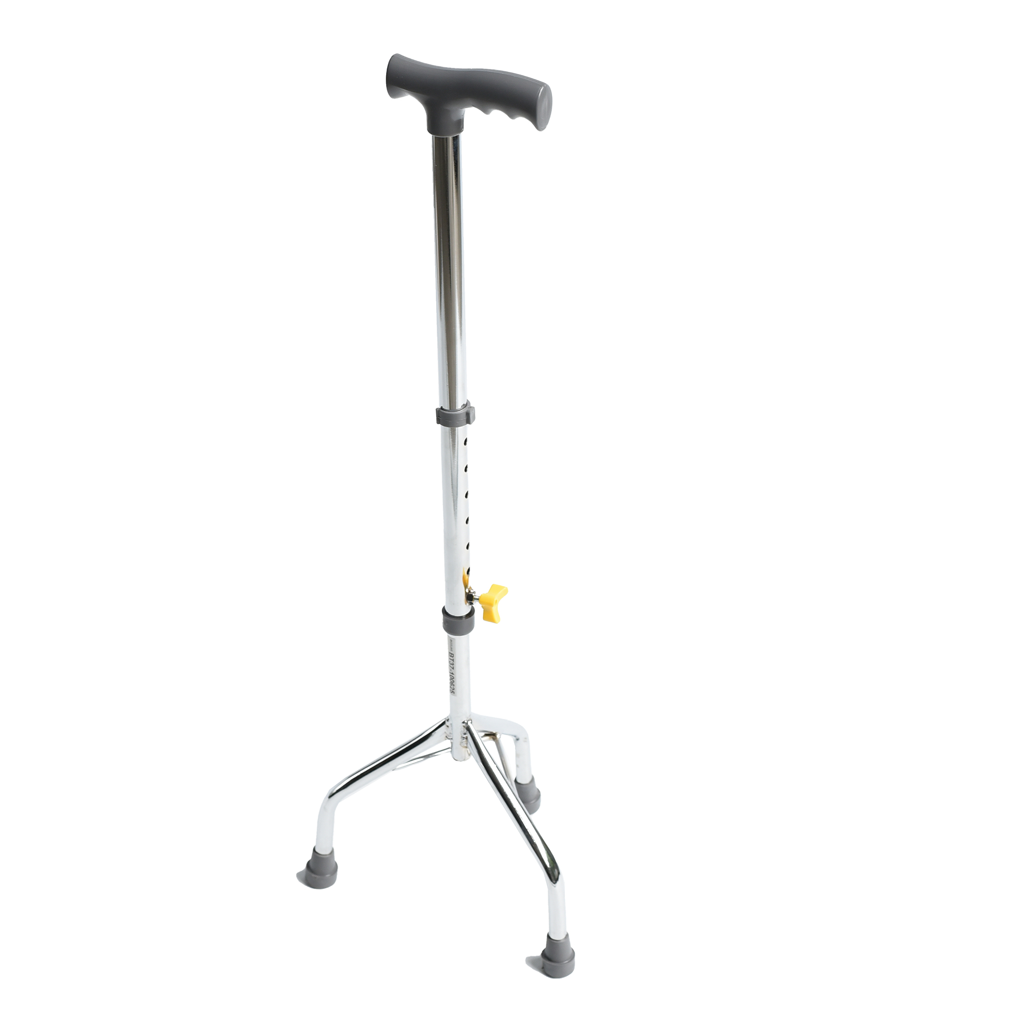 Bastón trípode de hierro pintado, mango en T, regulable.