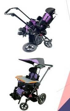 Silla postural pediátrica plegable con Tilt, respaldo reclinable y mesa acrílica.